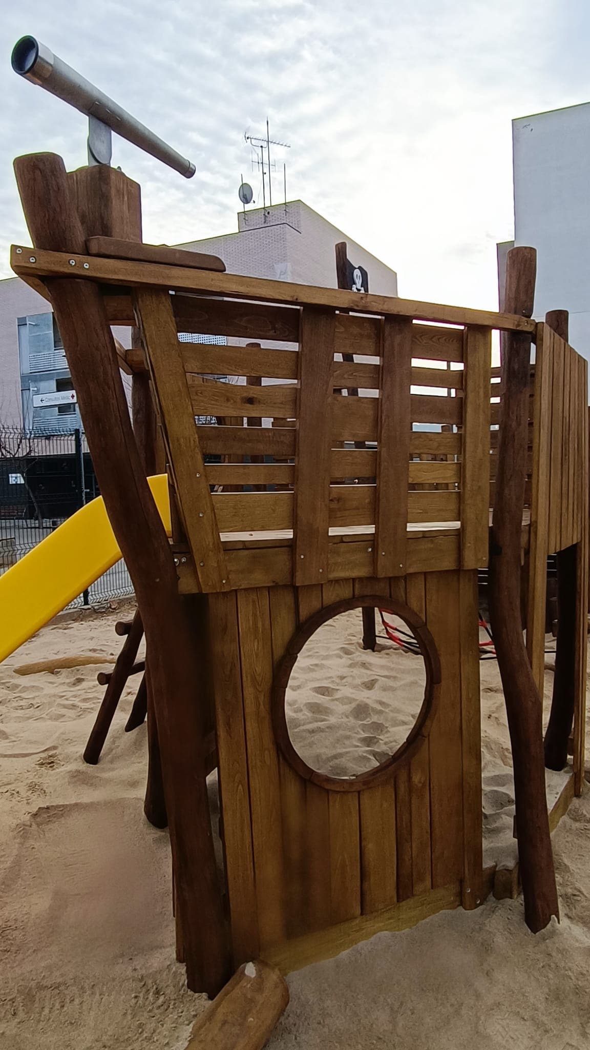 Multijuego simulando un barco, con tobogan, trepa, escaleras y juego de arena, hecho con madera de acacia