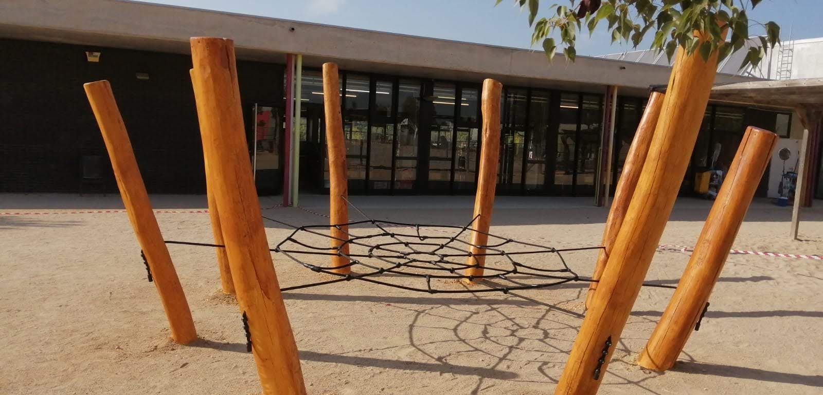 Trepa horizontal de madera de acacia y cuerdas con anima de acero, con forma de tela de araña.
