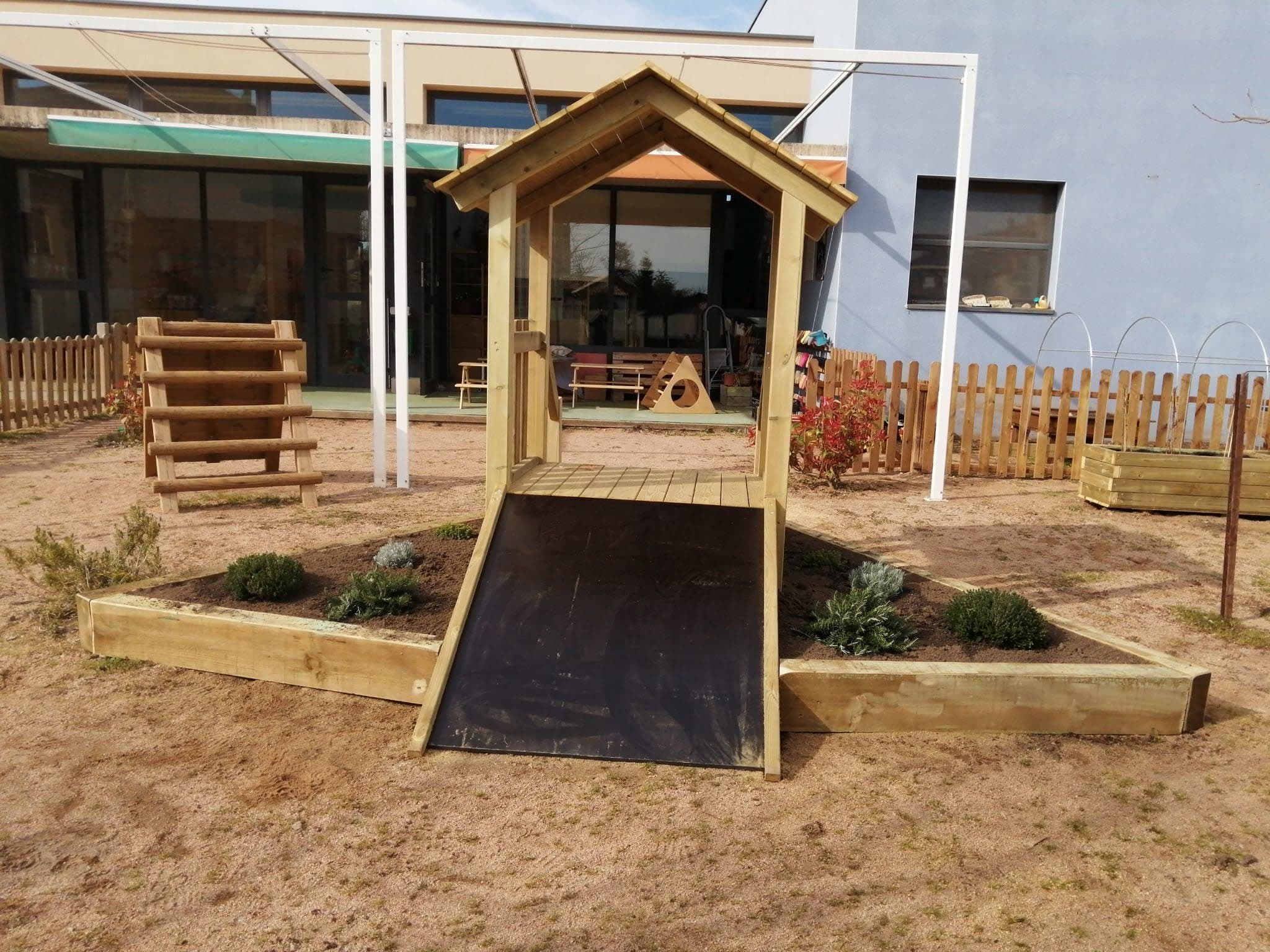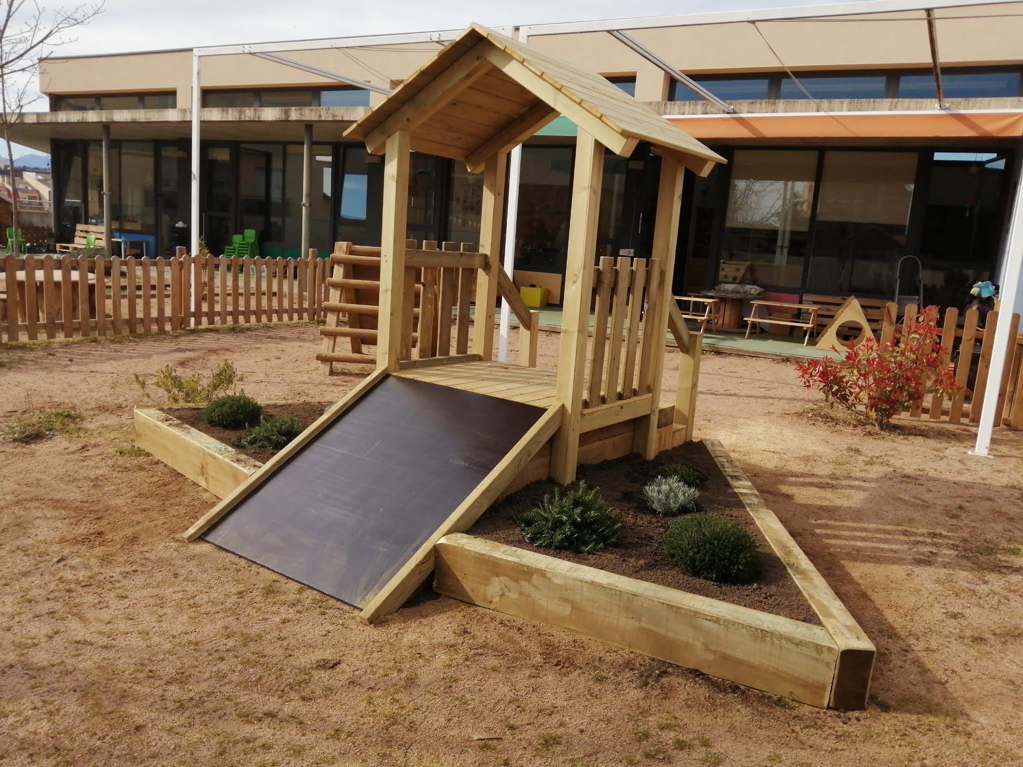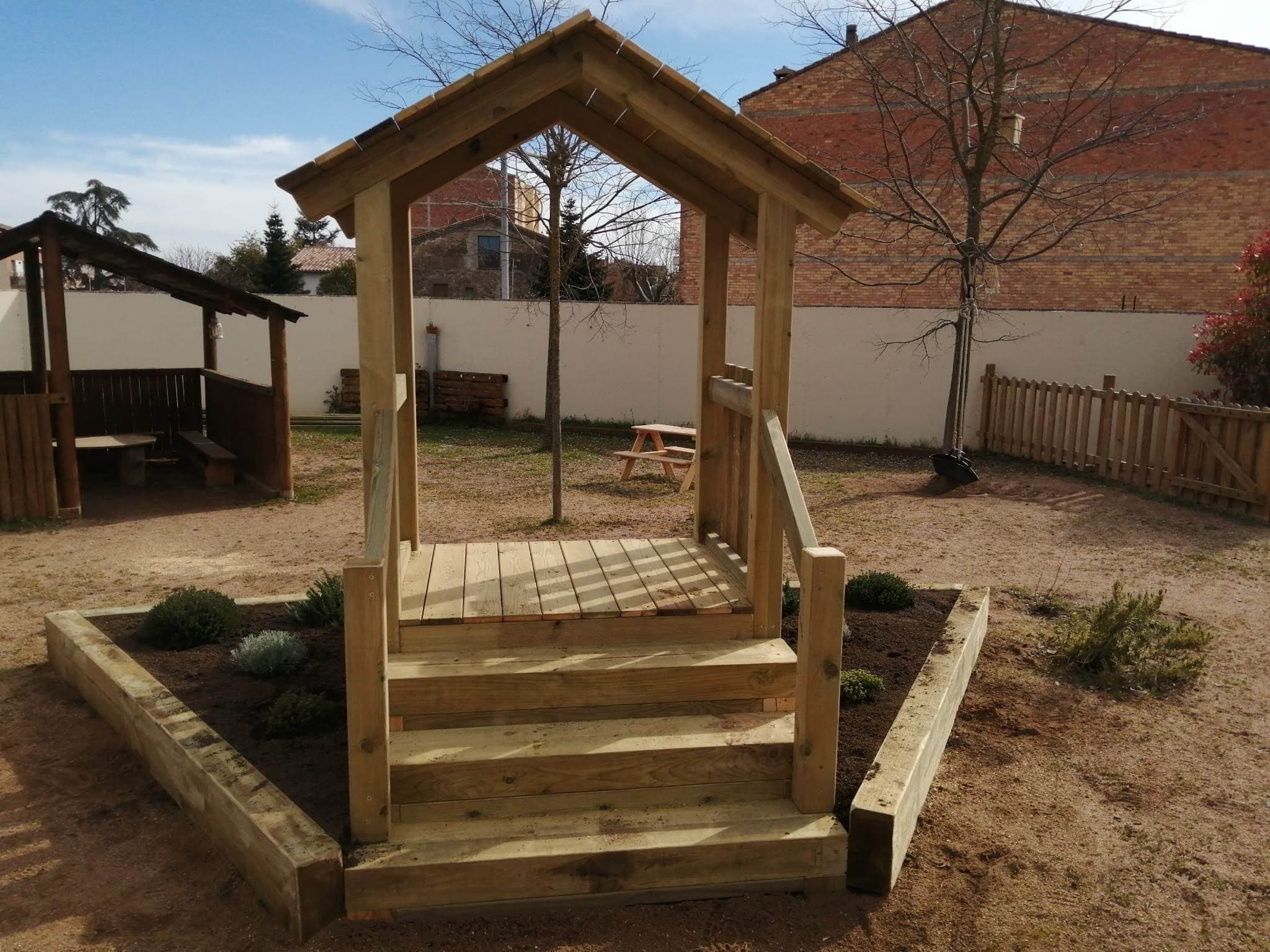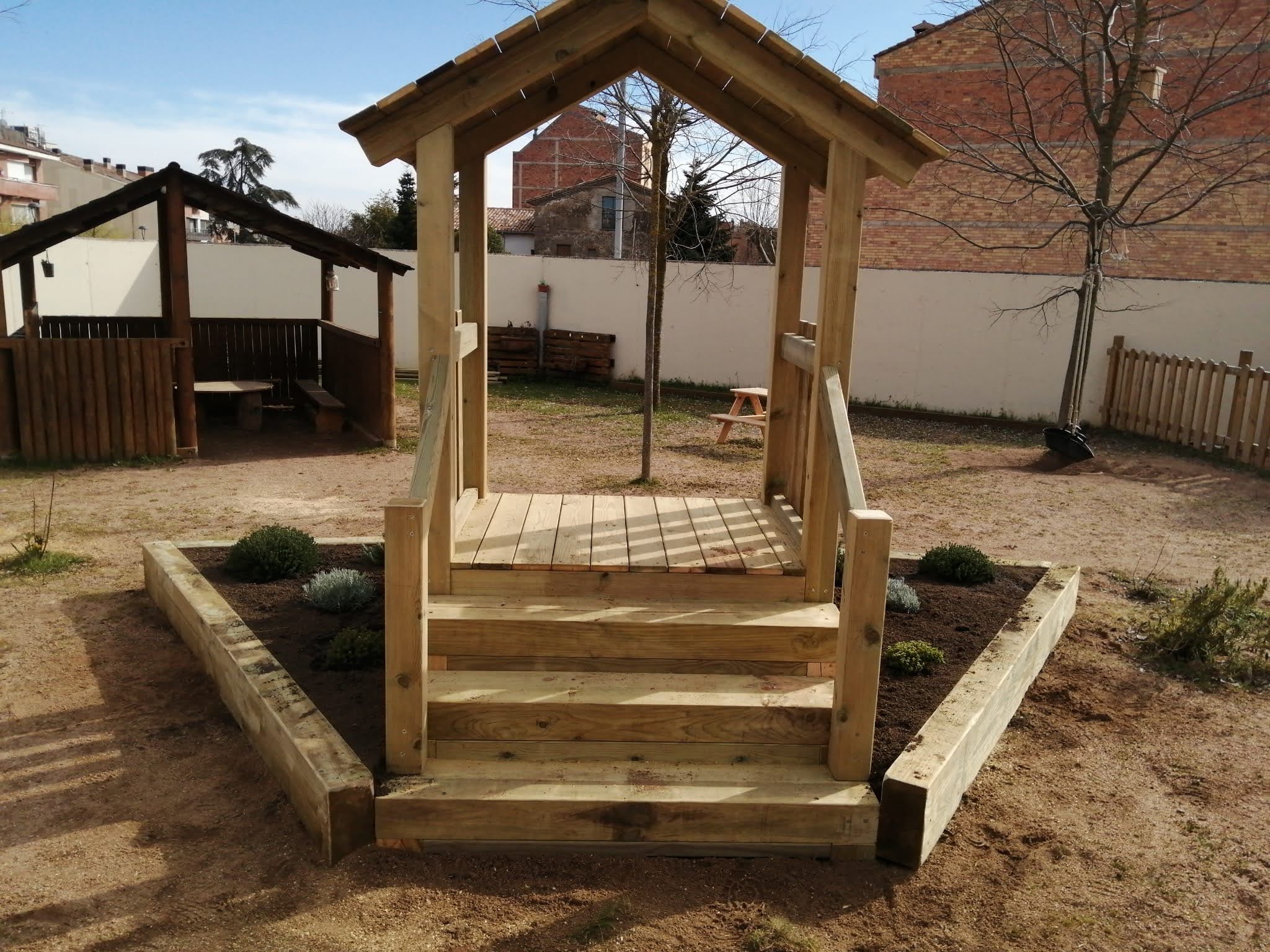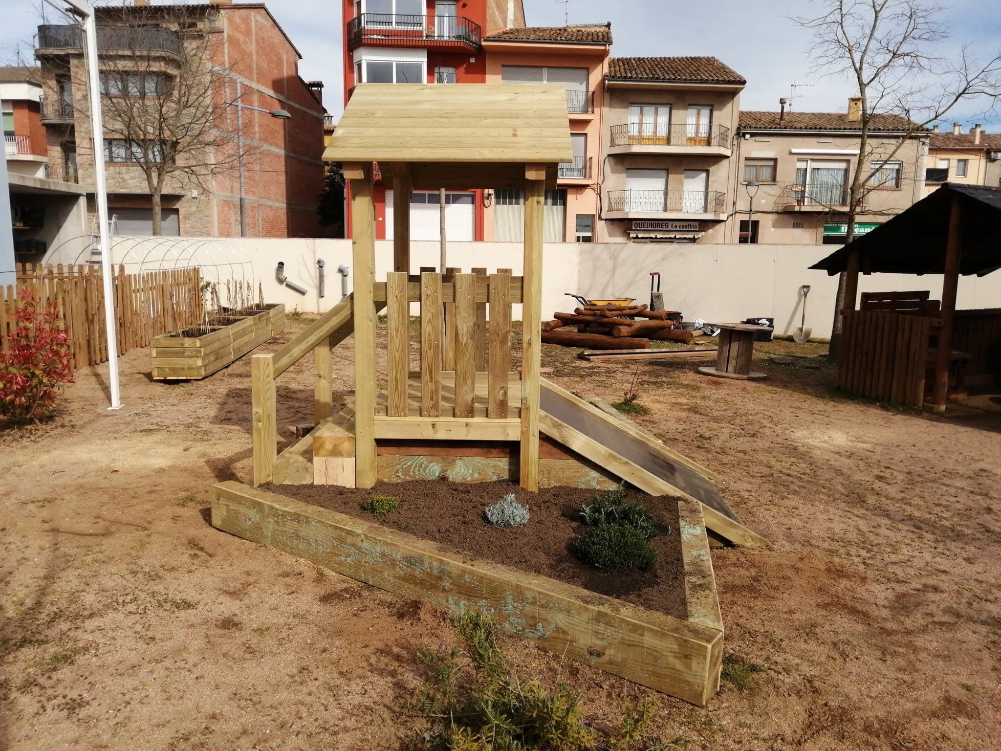 Formació de desnivells amb travesses de pi o troncs d'acàcia, rampa i plantació de plantes aromàtiques.